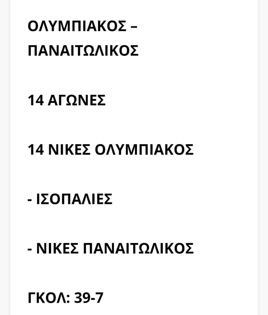 Το απόλυτο με αντίπαλο τον Παναιτωλικό έχει ο Ολυμπιακός, αφού έχει επικρατήσει και στις 14 φορές που έχει υποδεχθεί την ομάδα του Αγρινίου, ενώ αν προστεθούν