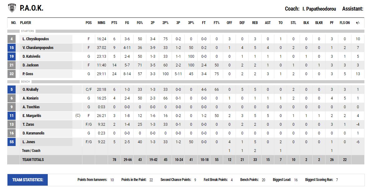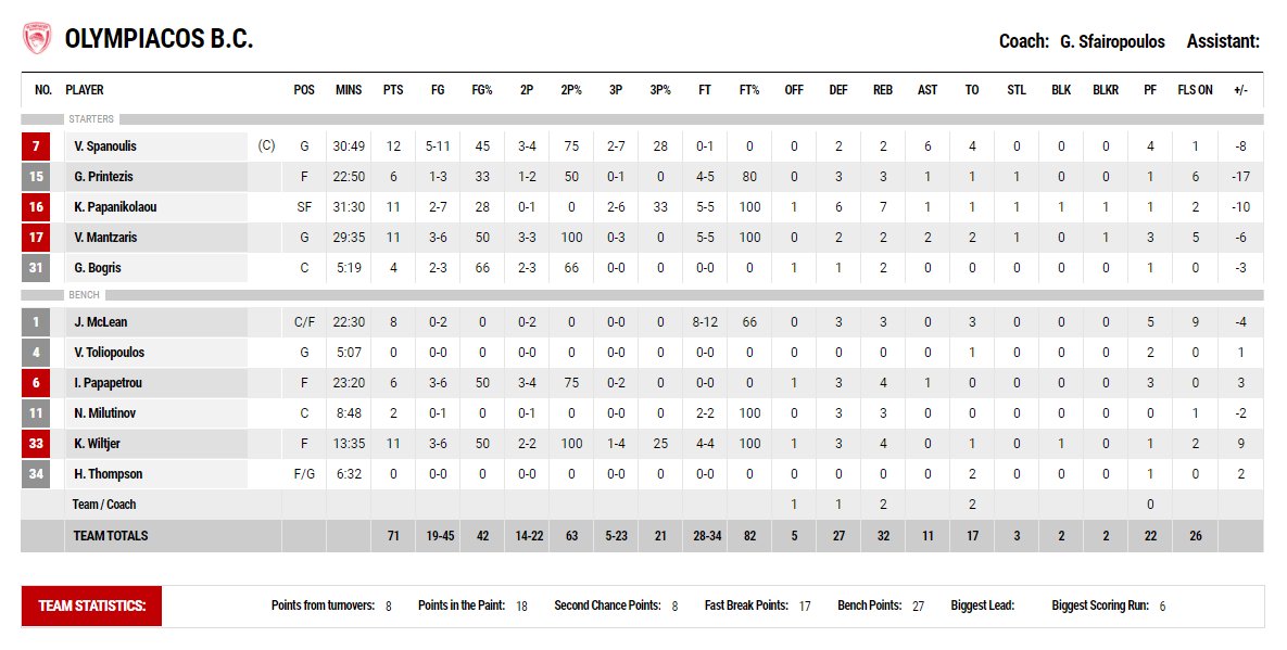 Ο Ολυμπιακός πραγματοποίησε την χειρότερη φετινή του εμφάνιση και ηττήθηκε με σκορ 78-71 από τον Π.Α.Ο.Κ. Τρίτη ήττα στο φετινό πρωτάθλημα για τους «ερυθρόλευκους» στο πρωτάθλημα.