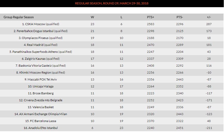 Ολοκληρώθηκε και η προτελευταία αγωνιστική της κανονικής περιόδου της Ευρωλίγκα, με τον Ολυμπιακό να βρίσκεται στην 3η θέση του βαθμολογικού πίνακα, με ρεκόρ 19-10.
