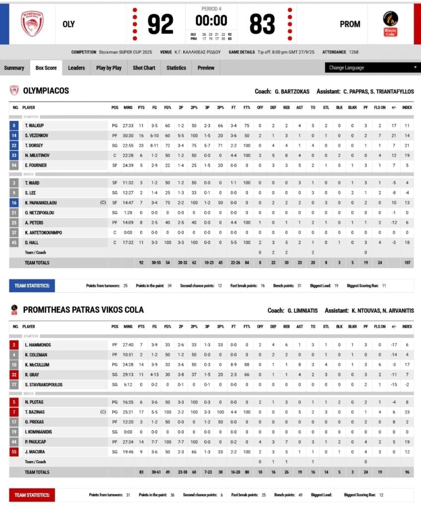 Ο Ολυμπιακός επικράτησε 92-83 του Προμηθέα Πατρών στον τελικό του Super Cup και κατέκτησε την πρώτη κούπα της χρονιάς!