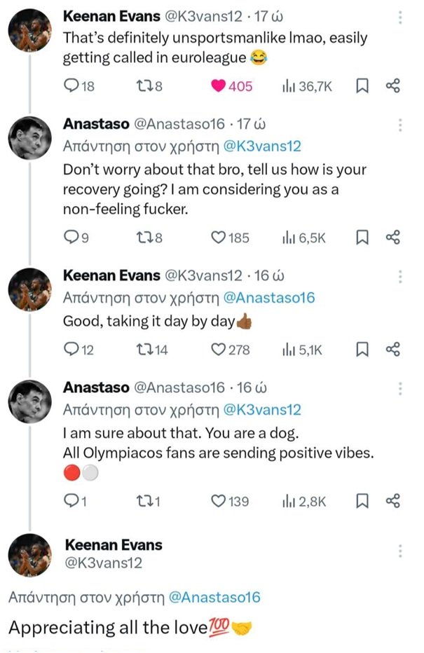Οι φίλαθλοι του Ολυμπιακού αδημονούν για την επιστροφή του Κίναν Έβανς στην αγωνιστική δράση. Ο Αμερικανός παίκτης αναρρώνει από την επέμβαση που υπεβλήθη και ένας φίλος των ερυθρόλευκων δεν παρέλειψε όταν είδε ποστάρισμά του στο Χ (twitter) για το τουρνουά μπάσκετ των Ολυμπιακών αγώνων, να τον ρωτήσει πως πηγαίνει η αποκατάσταση. Ο Έβανς απάντησε πως πάει καλύτερα, μέρα με τη μέρα και έκλεισε τη συνομιλία αναφέροντας πως εκτιμά την αγάπη που δέχεται από τον κόσμο! Αν μη τι άλλο, ακομπλεξάριστος και προσιτός! Δείτε παρακάτω:
