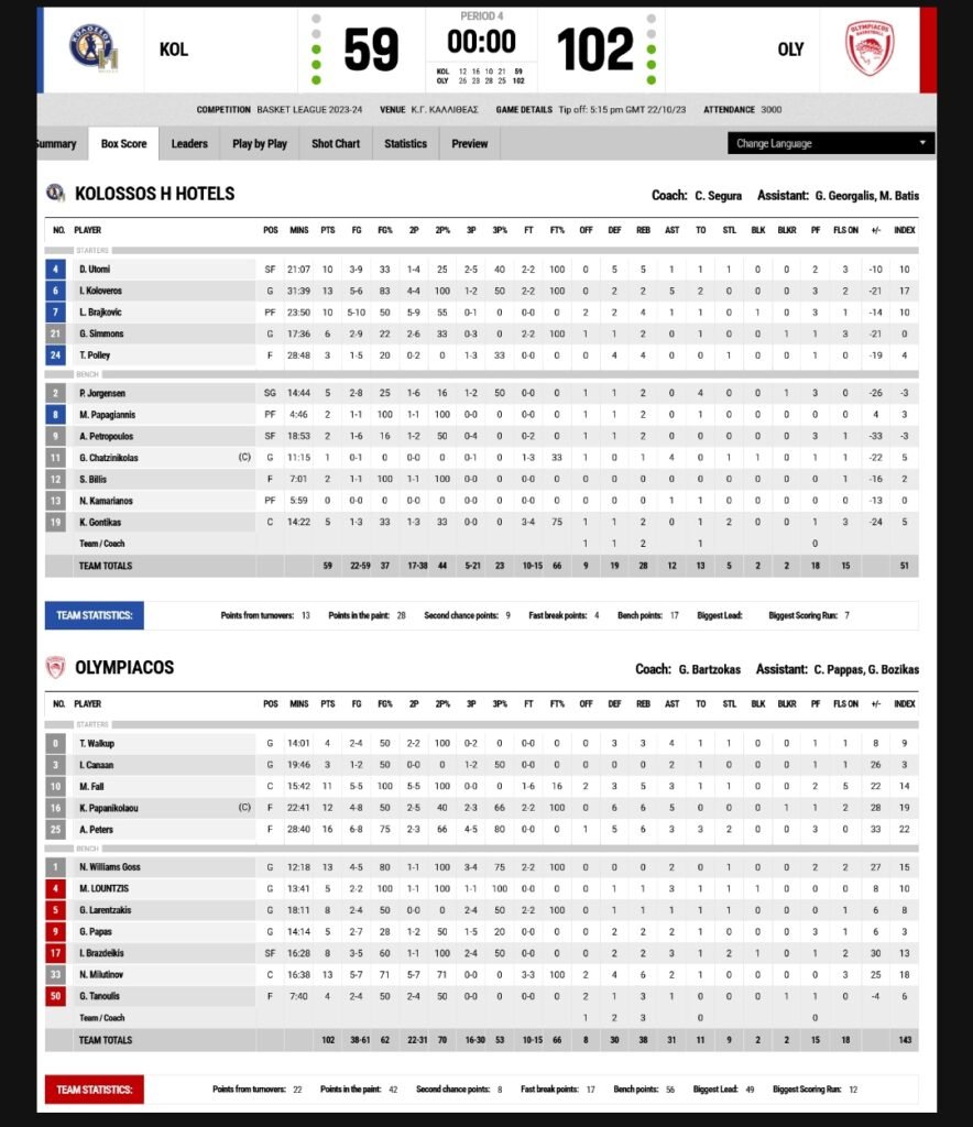 Ο Ολυμπιακός «συνέτριψε» στην Ρόδο τον Κολοσσό με 102-59 και παρέμεινε αήττητος στην Basket League.
