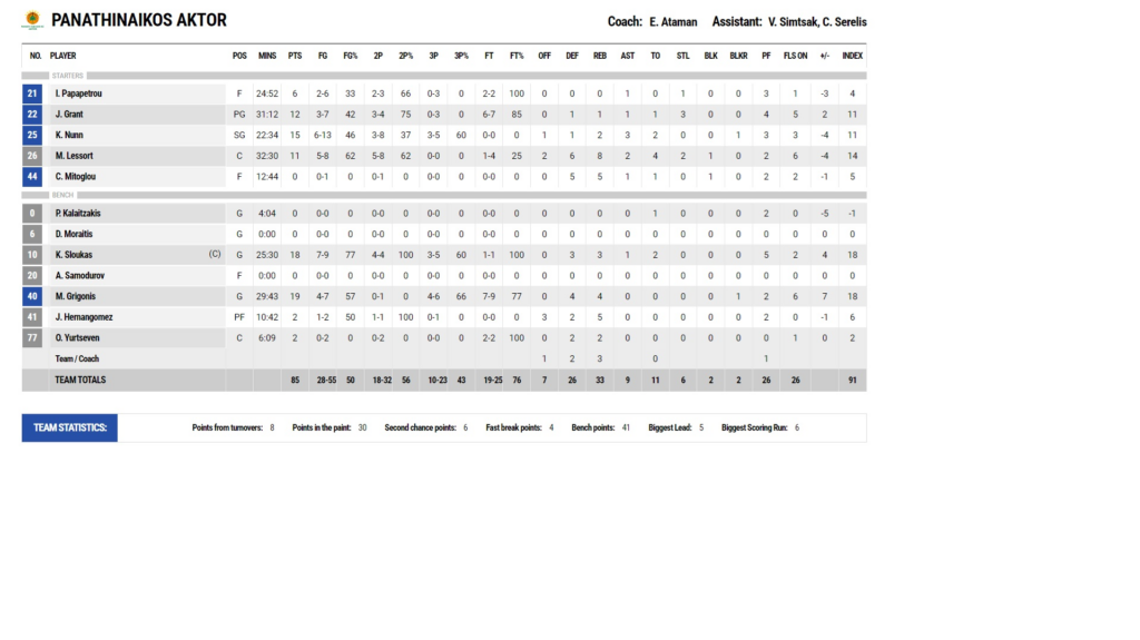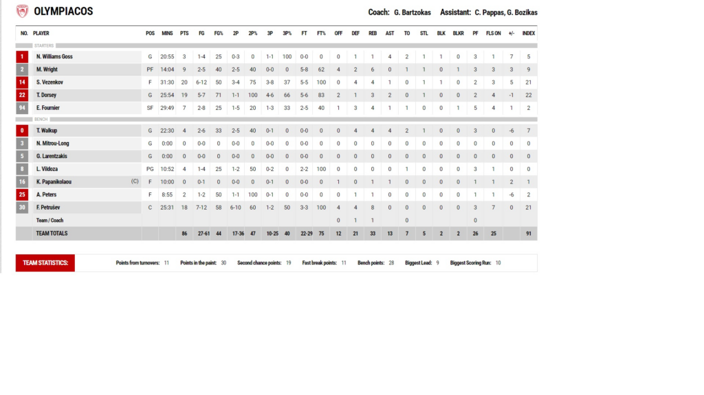 Με τον Ταίλερ Ντόρσεϊ να ξεκινά «καυτός» στον τελικό, ο Ολυμπιακός «έτρεξε» γρήγορα ένα επιμέρους σκορ 11-3 στα πρώτα 4 λεπτά του αγώνα, μέχρι το δυναμικό κάρφωμα του Μόουζες Ράιτ που έσπασε τη στεφάνη και οδήγησε σε μισάωρη διακοπή (6-12). Η αναμέτρηση συνεχίστηκε κανονικά μετά την αποκατάσταση της ζημιάς και οι Ερυθρόλευκοι συνέχισαν εξαιρετικά εύστοχοι από την περιφέρεια, δείχνοντας παράλληλα μεγάλη προσήλωση στην άμυνα. Η πρώτη περίοδος έκλεισε με τους Πειραιώτες στο +5 (16-21). Στο δεύτερο δεκάλεπτο, οι Φίλιπ Πετρούσεφ και Σάσα Βεζένκοφ μπήκαν στην επιθετική εξίσωση της ομάδας μας, που έφτασε στο +8 στο 19′ και τελικά πήγε στο ημίχρονο μπροστά στο σκορ με 7 πόντους (38-45).
