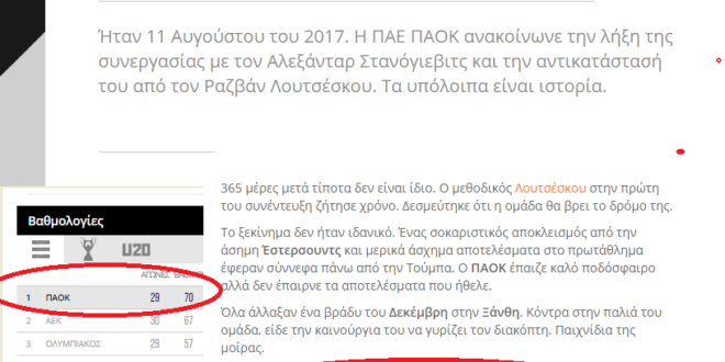Διάβασε περισσότεραH επίσημη σελίδα της ΠΑΕ ΠΑΟΚ έκανε έναν απολογισμό της θητείας του Ρουμάνου τεχνικού Ραζβάν Λουτσέσκου και με έκπληξη διαπιστώσαμε ότι το σχετικό άρθρο αναφέρει ότι κατέκτησε πανάξια το Πρωτάθλημα Ελλάδος στην πρώτη του σεζόν! Στην αρχή πιστέψαμε ότι ο υπεύθυνος του επίσημου ιστοτόπου της ασπρόμαυρης ΠΑΕ τρολάρει ή απλά αυτοσαρκάζεται! Ωστόσο συνεχίζοντας την περιήγηση μας στη σελίδα πέσαμε πάνω στη ...