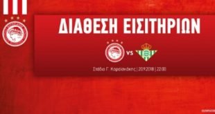 H ΠΑΕ ΟΛΥΜΠΙΑΚΟΣ, για τον αγώνα της 1ης Αγωνιστικής του UEFA EUROPA LEAGUE απέναντι στην REAL BETIS BALOMPIE που θα διεξαχθεί στο στάδιο “Γ. ΚΑΡΑΪΣΚΑΚΗΣ” την Πέμπτη 20/9/18 και ώρα 22:00, ενημερώνει τους φίλους της ομάδας για τα εξής: Τα εισιτήρια του αγώνα θα διατίθενται από τα εκδοτήρια του σταδίου “Γ. ΚΑΡΑΪΣΚΑΚΗΣ”, που βρίσκονται έξω από τη Θύρα 25, ...