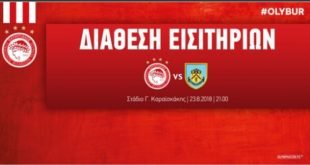 H ΠΑΕ ΟΛΥΜΠΙΑΚΟΣ, για τον αγώνα της Φάσης των Play Offs του UEFA EUROPA LEAGUE απέναντι στη BURNLEY που θα διεξαχθεί στο στάδιο “Γ. ΚΑΡΑΪΣΚΑΚΗΣ” την Πέμπτη 23/8/18 και ώρα 21:00, ενημερώνει τους φίλους της ομάδας για τα εξής: Τα εισιτήρια του αγώνα θα διατίθενται από τα εκδοτήρια του σταδίου “Γ. ΚΑΡΑΪΣΚΑΚΗΣ”, που βρίσκονται έξω από τη Θύρα 25, ...