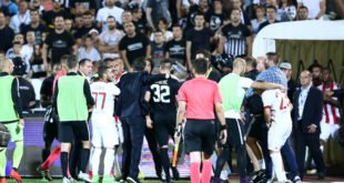 Με την ολοκλήρωση του Α΄ ημιχρόνου, οπαδοί της Παρτίζαν πέταξαν αντικείμενα στους παίκτες του Ολυμπιακού, οι οποίοι κατευθυνόταν προς τ’ αποδυτήρια.