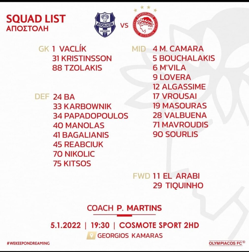 Από 23 ποδοσφαιριστές αποτελείται η αποστολή του Ολυμπιακού για το εκτός έδρας ματς με τον Απόλλωνα Σμύρνης.